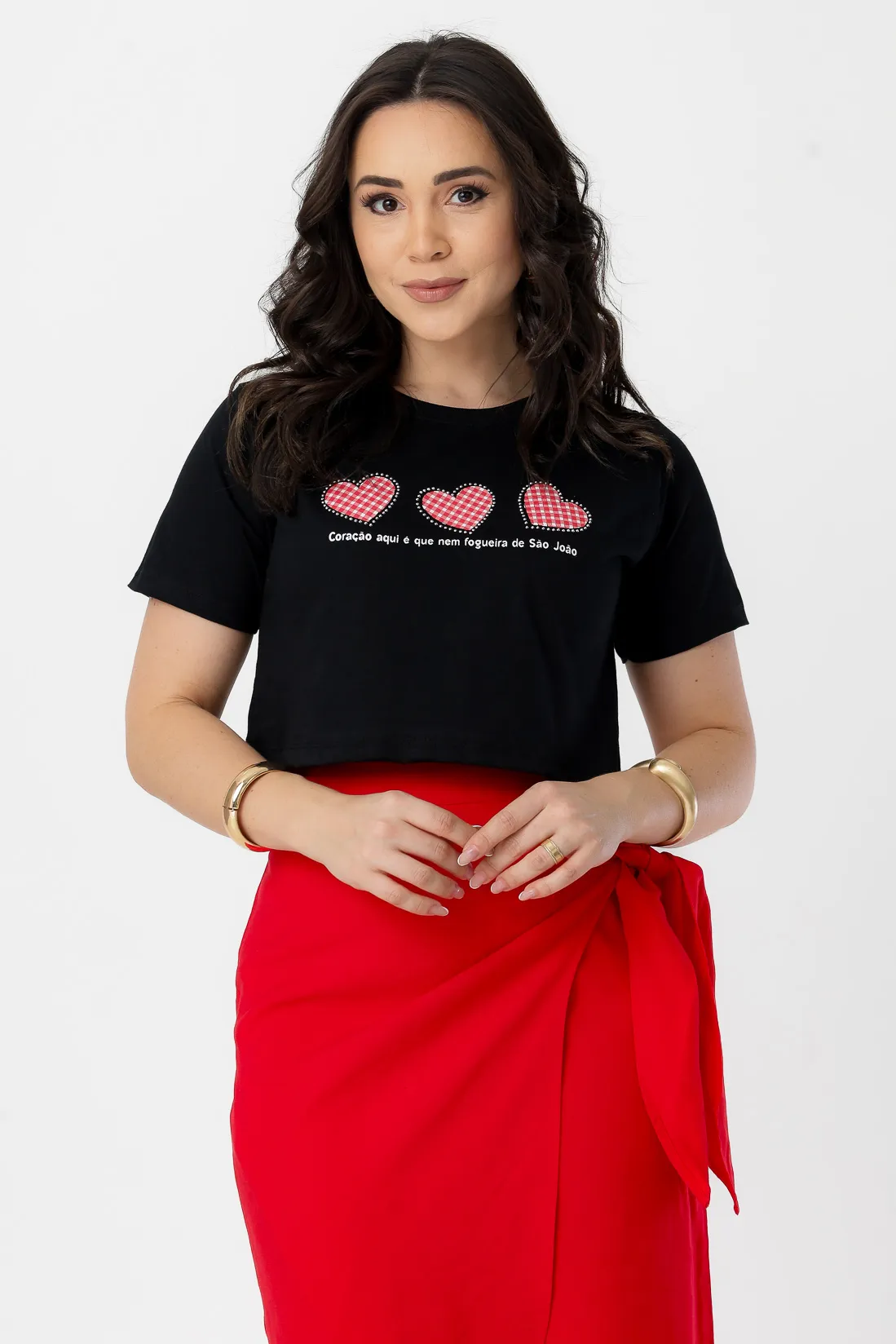 CROPPED CORACAO AQUI E QUE NEM FOGUEIRA DE SAO JOAO CORACOES STRASS - COR PRETO